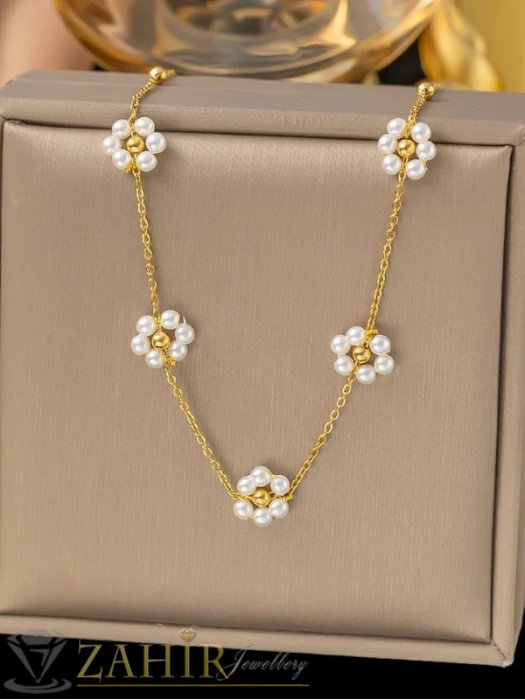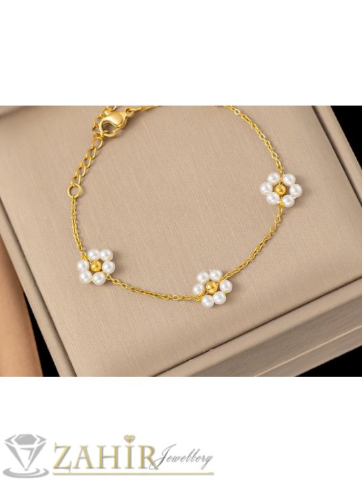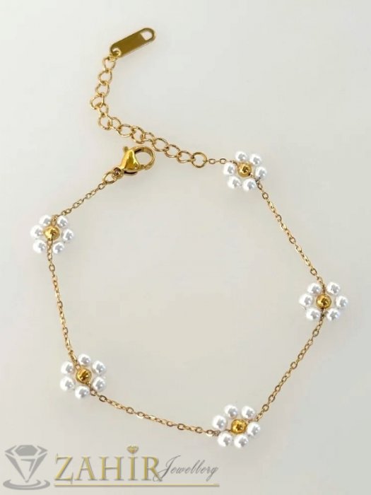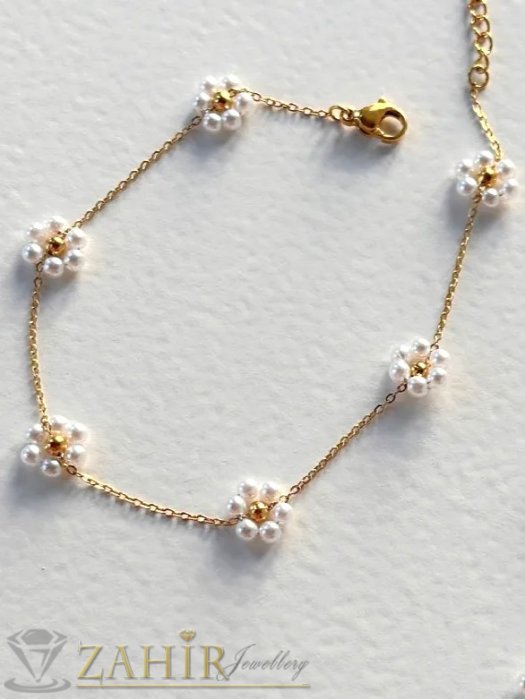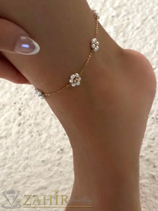 Дамски бижута - 5 нежни перлени цветчета на стоманена гривна за крак или за ръка , златно покритие , широка 0,1 см регулира се - GK1412