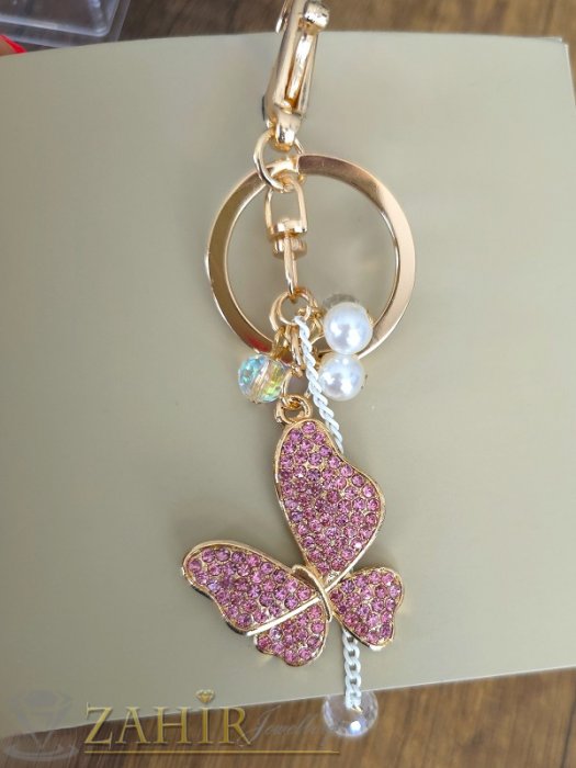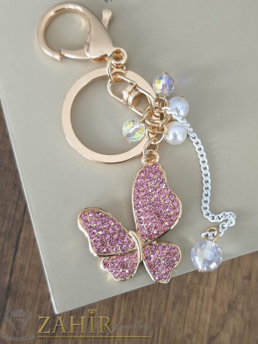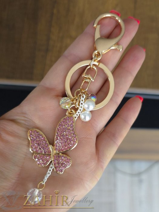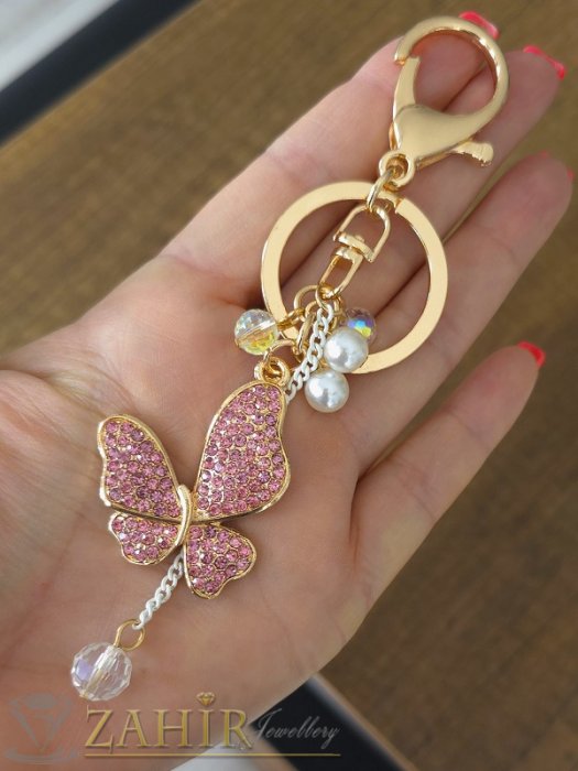 Аксесоари за коса - Уникално красива пеперуда с розови кристали и перлени висулки на позлатен ключодържател 14 см - KL1225