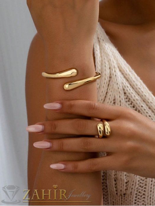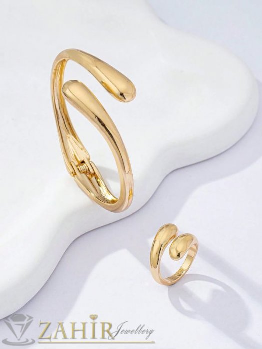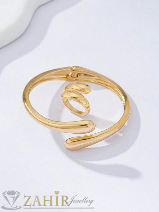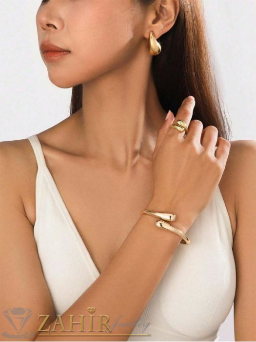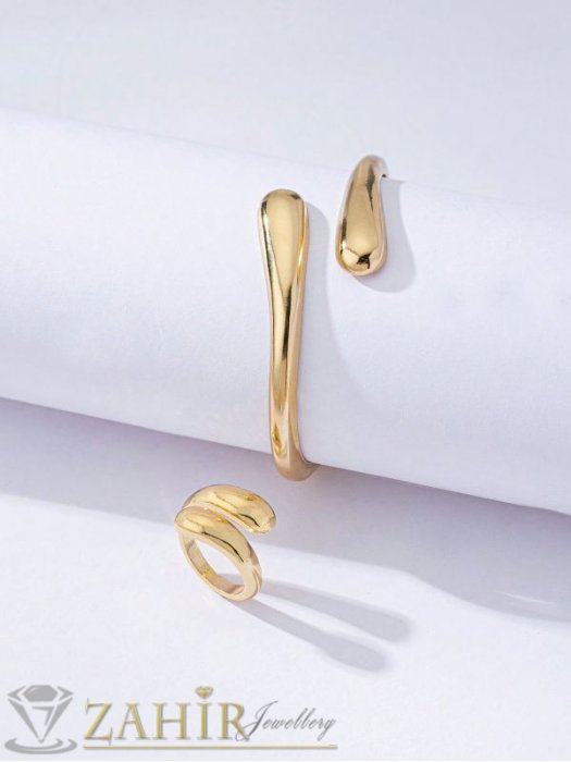 ДАМСКИ БИЖУТА - Актуален комплект с капковидни форми, регулируема гривна и пръстен на златиста основа - KO2243