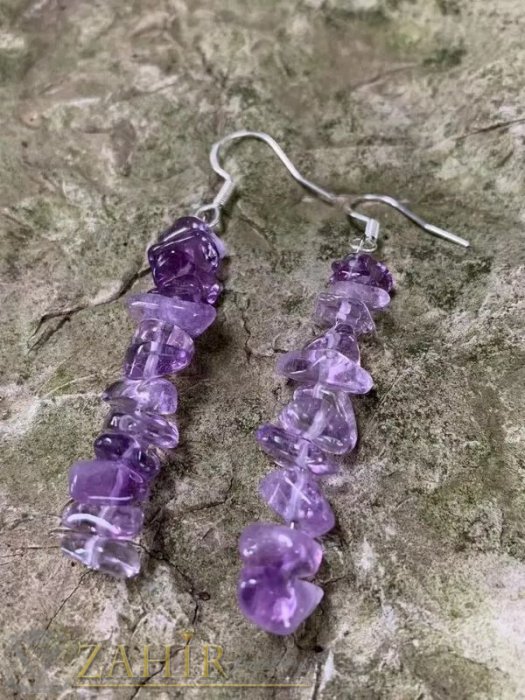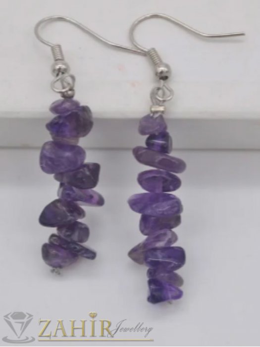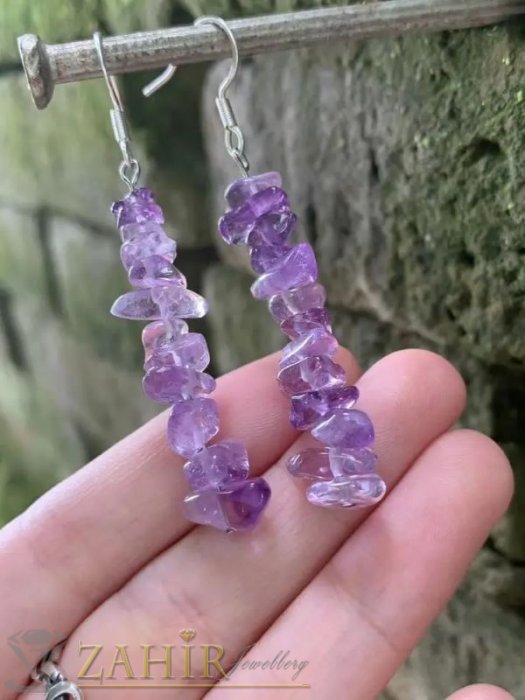 АРТ БИЖУТА С МЪНИСТА - Актуални висящи обеци 5 см с естествени камъни чипс Аметист, на кукичка, ръчна изработка - N1186