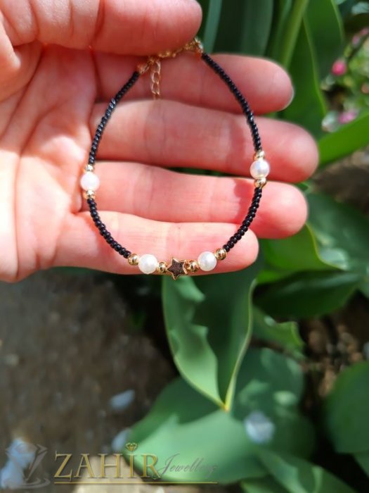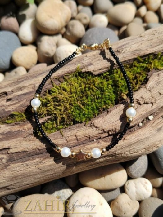 АРТ БИЖУТА ОТ МЪНИСТА - Елегантна ръчно изработена гривна с малка звезда, перли и черни стъклени мъниста , дълга 17 + 5 см - N1122