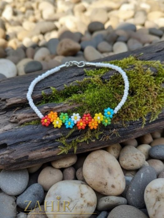 АРТ БИЖУТА ОТ МЪНИСТА - Интересна бяла гривна за крак или за ръка с разноцветни маргаритки ръчна изработка от стъклени чешки мъниста - N1126