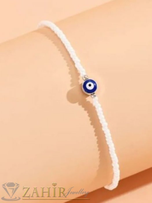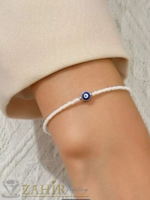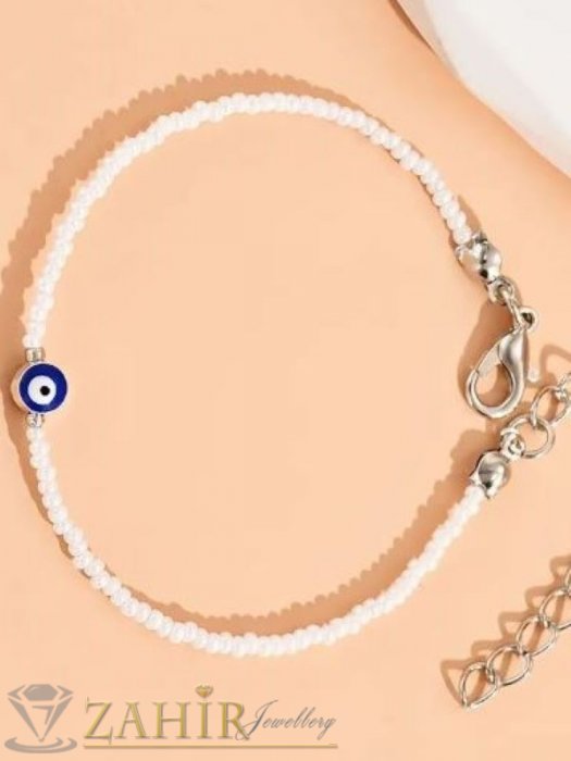 АРТ БИЖУТА С МЪНИСТА - Изчистена ръчно изработена гривна за ръка или крак от бели стъклени мъниста и синьо око - N1425