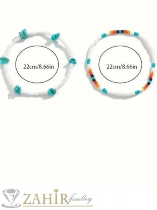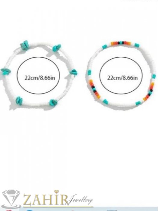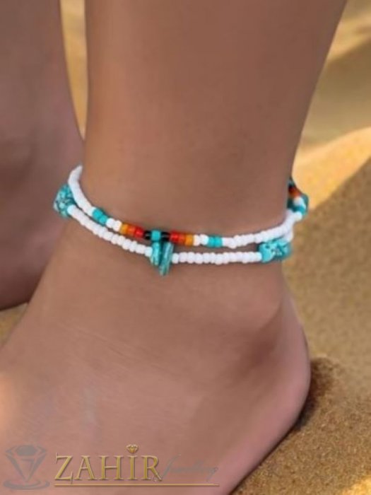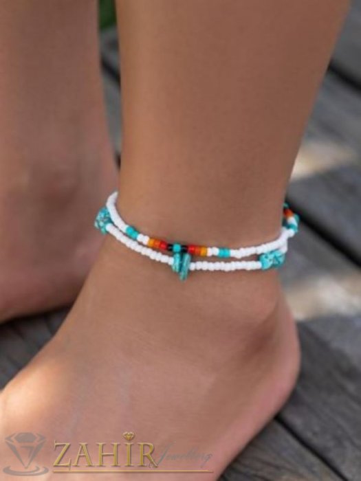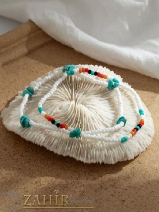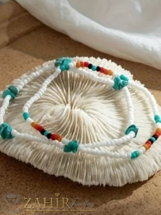 АРТ БИЖУТА С МЪНИСТА - Изящни ръчно изработени гривни за крак или ръка с бели, цветни стъклени мъниста и камъни чипс тюркоаз, дълги 22 см - N1446