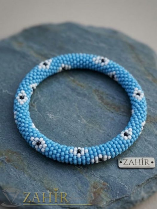 АРТ БИЖУТА С МЪНИСТА - Нежна хендмейд гривна с малки бели цветя от оригинални чешки бели и сини стъклени мъниста - N1017