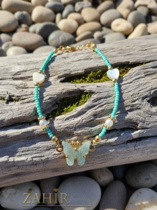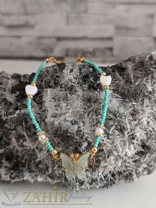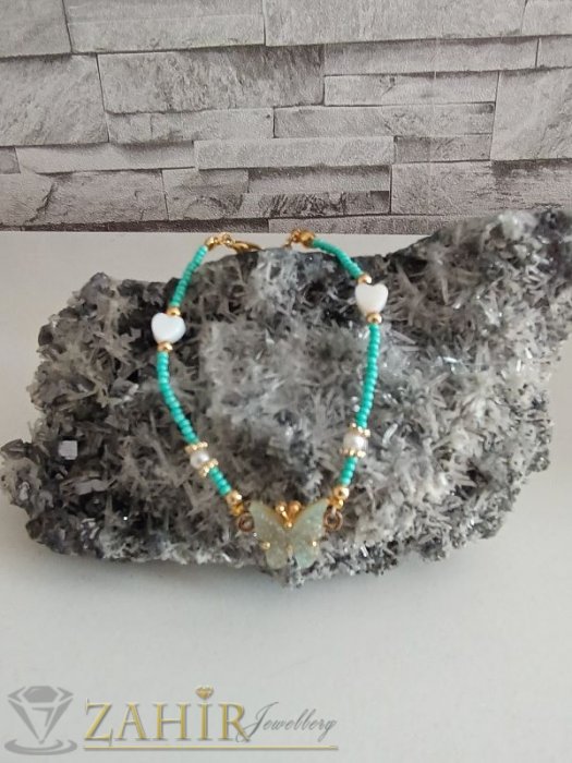 АРТ БИЖУТА ОТ МЪНИСТА - Ръчно изработена гривна с пеперуда 1,5 см,синьо зелени стъклени мъниста и сърчица от седеф, дълга 17 + 5 см - N1119