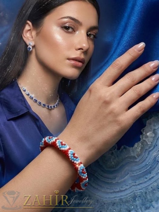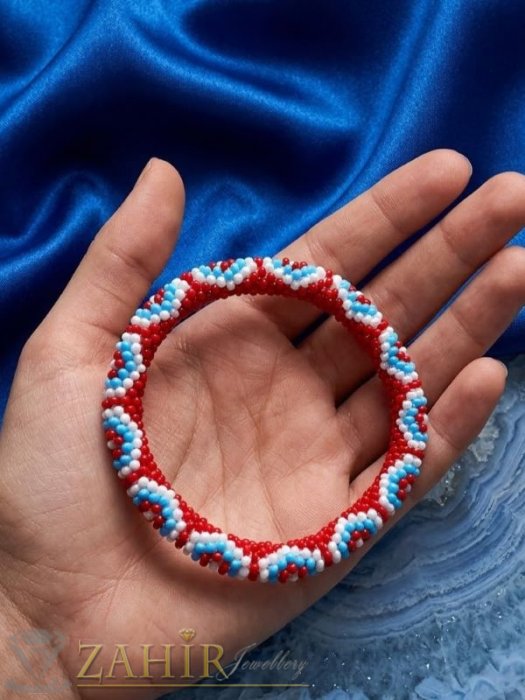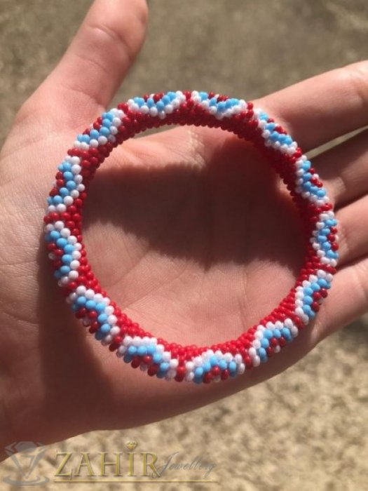 Разпродажба - Ръчно плетена гривна от оригинални чешки червени бели и светло сини стъклени мъниста - N1002