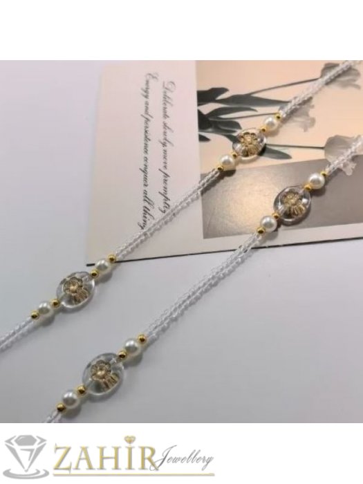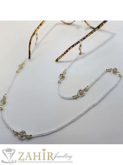 АРТ БИЖУТА С МЪНИСТА - Изискана прозрачна верижка за очила със златни детайли и цветя, дълга 74 см - N1660