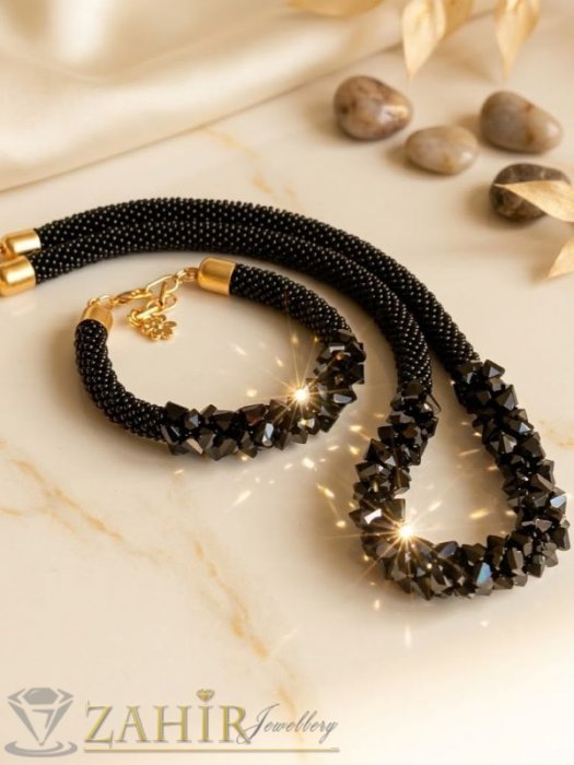 Пленителен ръчно изработен комплект колие и гривна, създаден, за да озари всяка визия! Изработен с внимание до най-малкия детайл от стъклени перли с кристален отблясък, този аксесоар отразява светлината по изумителен начин и създава усещане за лукс и нежност.
