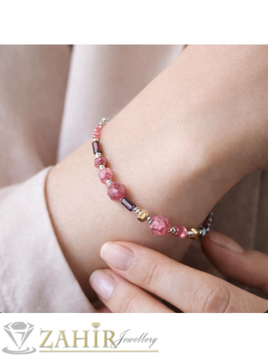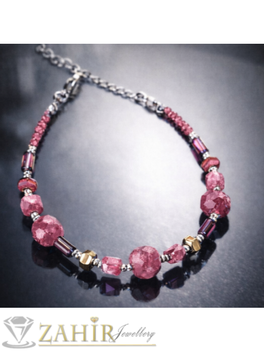 ДАМСКИ БИЖУТА - Бутикова хендмейд гривна с луксозни кристали в розово и сребристо с естествени камъни розов турмалин куб фасета 6 и 8 мм , сребристи стоманени детайли, размер 17-22 см - V1142