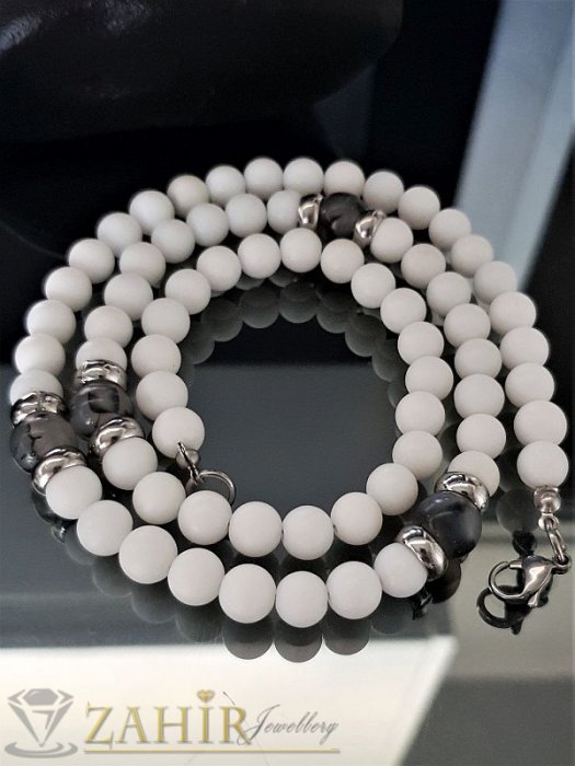 Бяло матово колие от ест. ахат 8 мм и драконови вени 10 мм, детайли от стомана, 3 размера