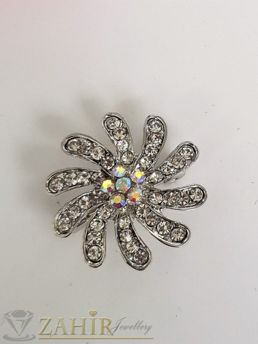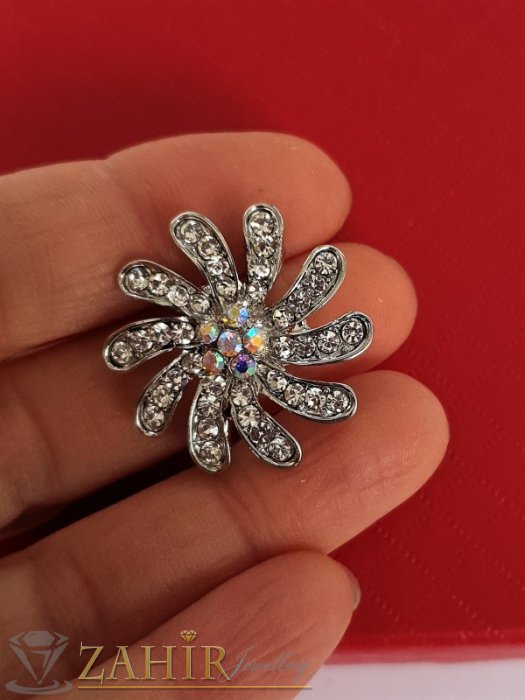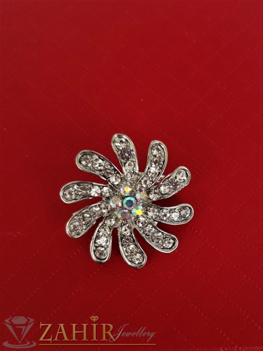 Малка семпла брошка кристално цвете с размери 2,5 на 2,5 см, сребърно покритие, бели кристали