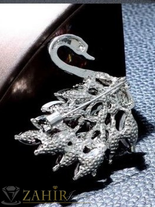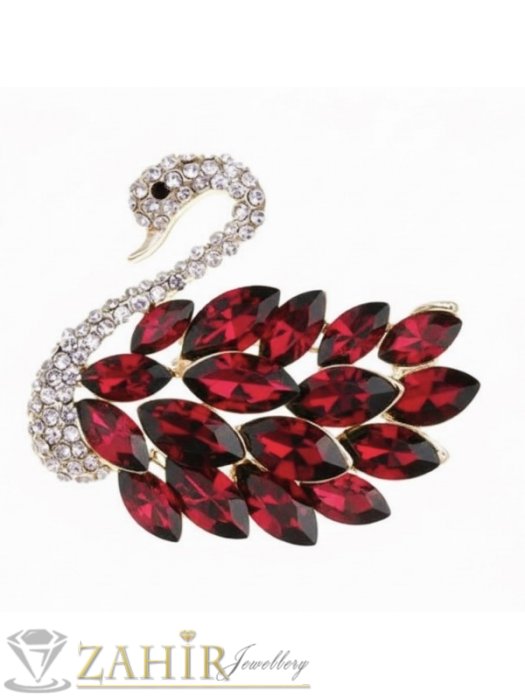 ДАМСКИ БИЖУТА - Ослепителен лебед кристална брошка с изящни бели и червени кристали фасета, размери 4,5 на 4 см, сребриста основа - B1534