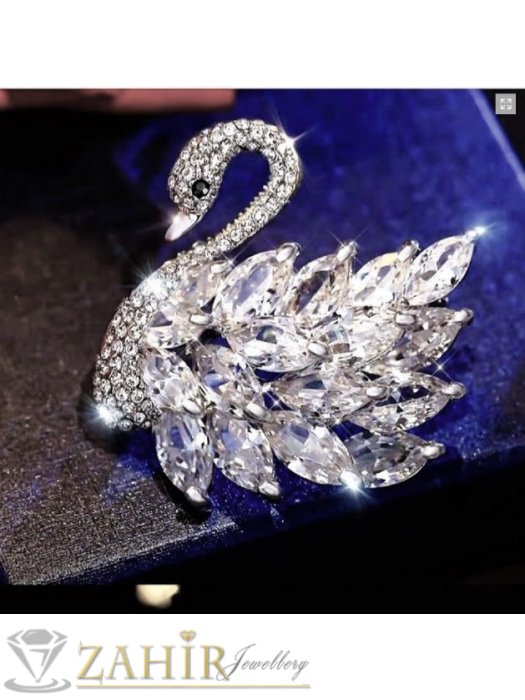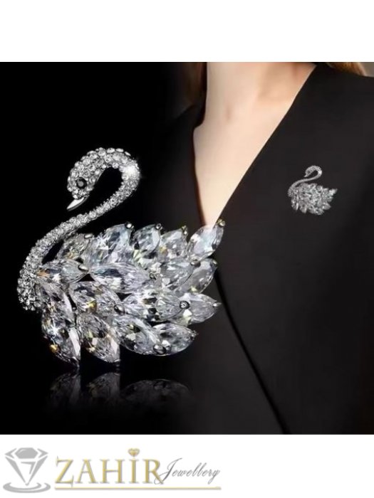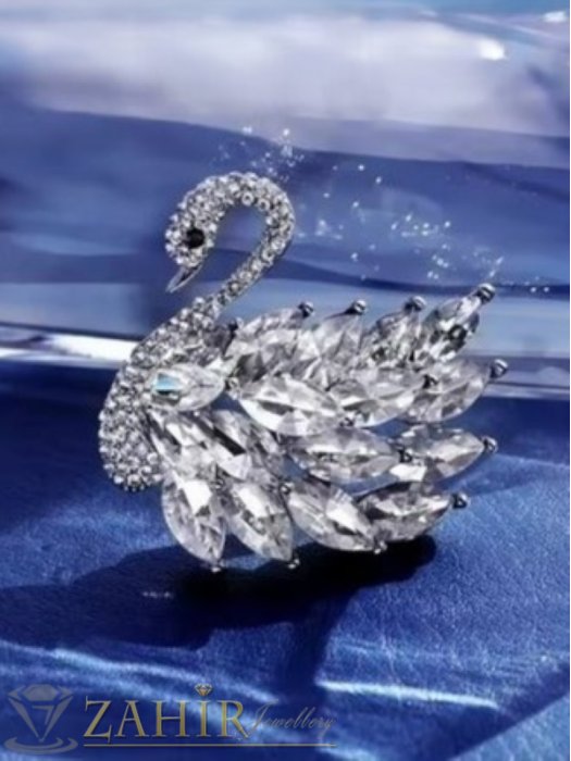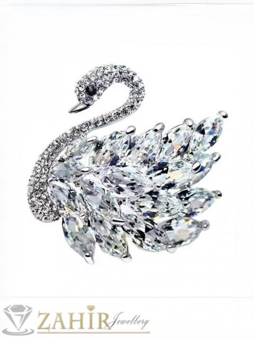 ДАМСКИ БИЖУТА - Уникално красив лебед кристална брошка с изящни фасетирани бели кристали, размери 4 на 3,5 см, сребриста основа - B1252