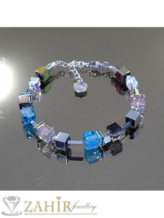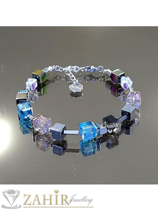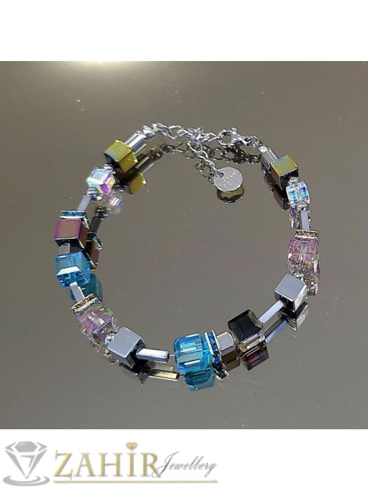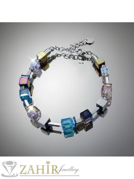 ДАМСКИ БИЖУТА - Великолепна хендмейд гривна с луксозни кристали Аурора Бореалис и естествени камъни цветен хематит 6 мм , стоманени детайли, кристални рингове ,размер 16-23 см - V1081