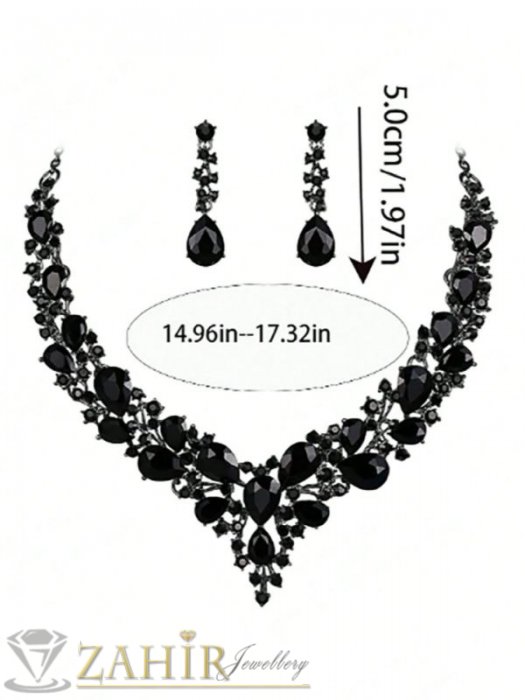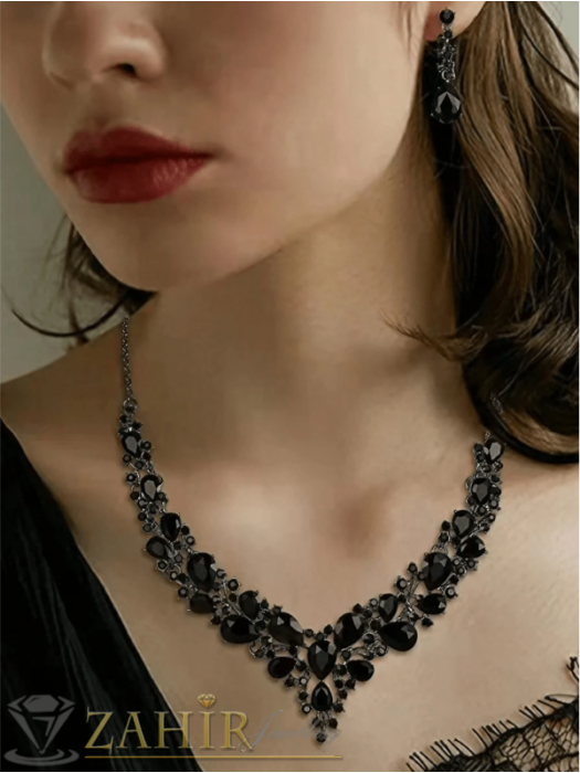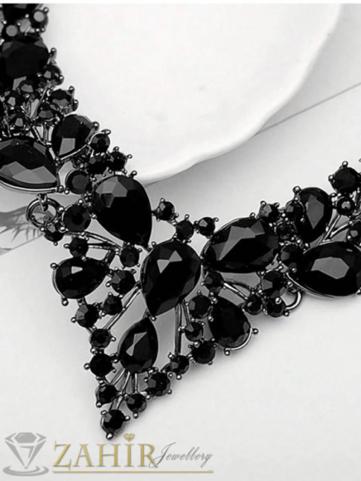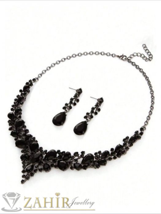 ДАМСКИ БИЖУТА - Дизайнерски луксозен комплект с малки и големи черни кристали на черна метална основа, обеци 5 см и регулиращо се колие от 42 до 50 см - KO2197
