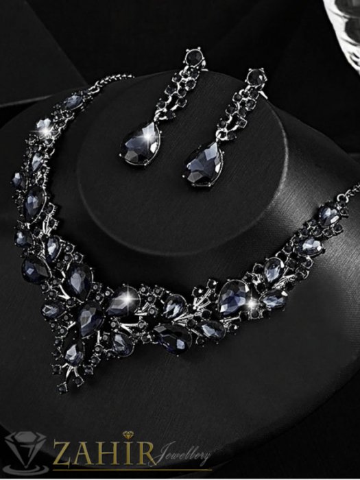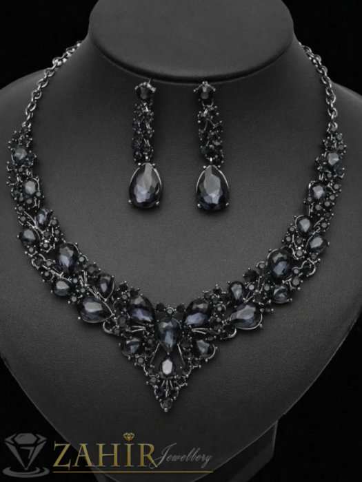 Дизайнерски луксозен комплект с черни и графитени кристали, обеци 5 см и регулиращо се колие, виси 9 см