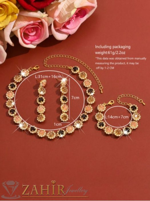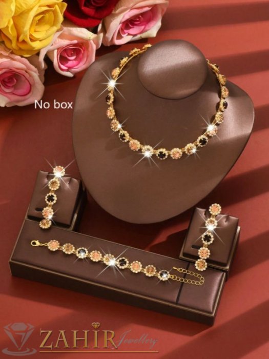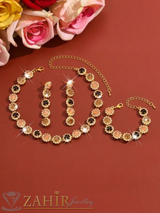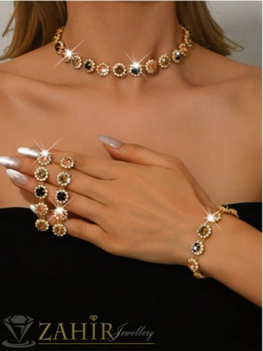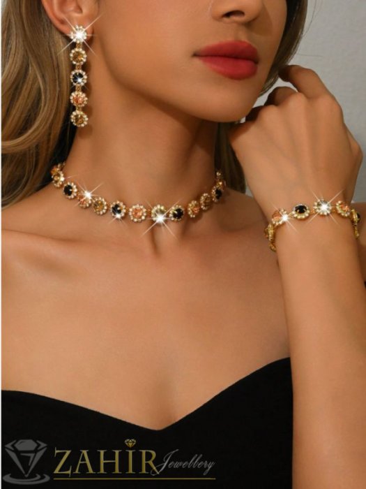 ДАМСКИ БИЖУТА - Дизайнерски луксозен комплект с преливащи бежово-кафяви и черни кристали на златиста метална основа, регулиращо се колие от 31 + удължител 15 см, гривна 14 + 7 см и обеци на винт 7 см- KO2218