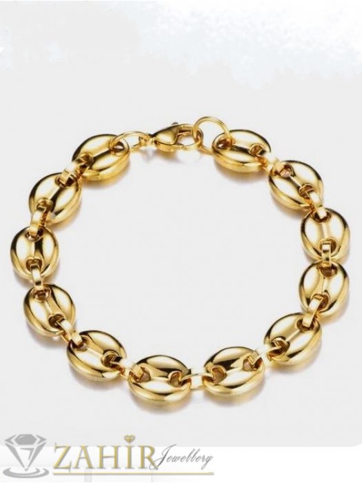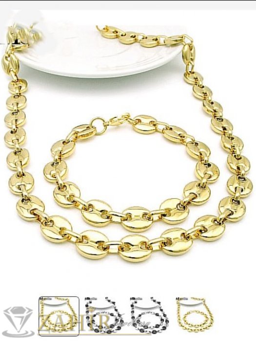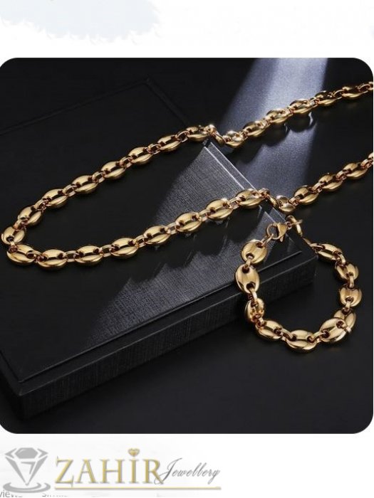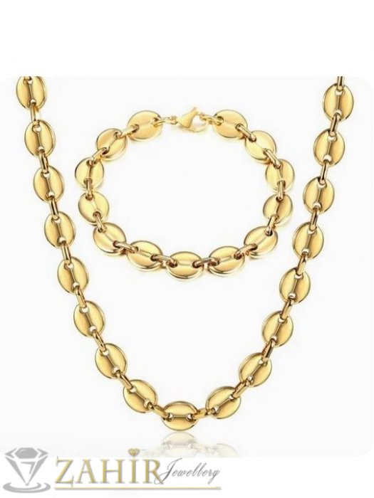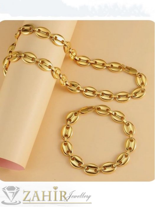 Дамски бижута - Дизайнерски позлатен стоманен комплект колие и гривна в 4 дължини, широк 1 см, полирани овални плочки, бобена плетка - KO2123