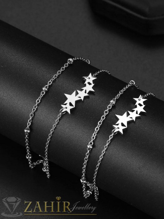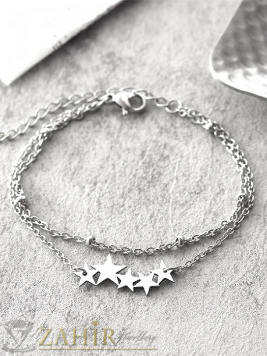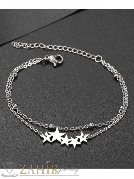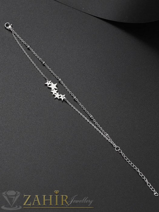 Дамски бижута - Двойна стоманена гривна за глезен или ръка с 5 нежни звездички и верижка с топчета, не променя цвета си - GK1440