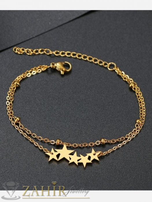 Дамски бижута - Двойна стоманена гривна за глезен или ръка с 5 нежни звездички и верижка с топчета, златно покритие - GK1439