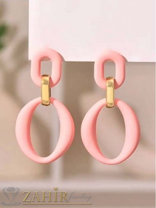 ДАМСКИ БИЖУТА - Двойни акрилни висящи обеци с овални форми в нежно розово със златисти детайли, размер 6 на 3 см, закопчаване на щифт- C1191