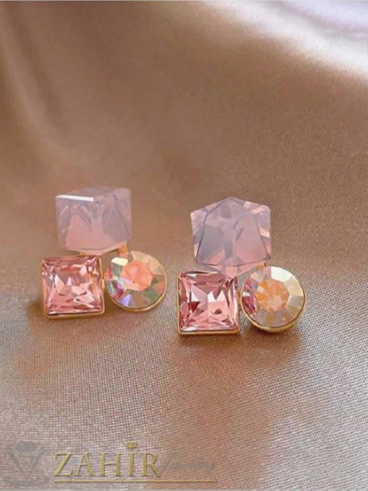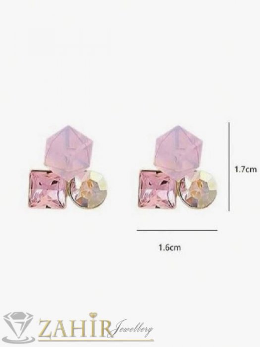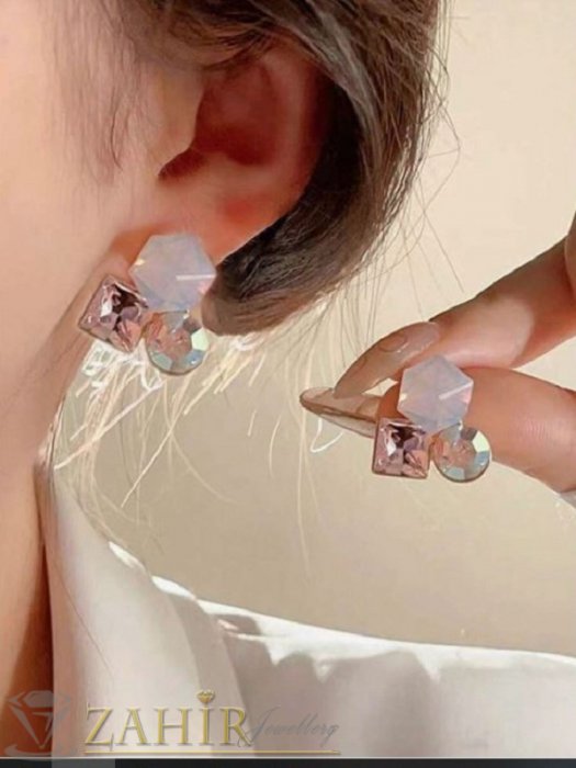 ЦВЕТНИ ОБЕЦИ - Ефектни олекотени обеци с розово кубче, розови бял кристал, размери 2 на 1,5 см , закопчаване на винт- C1246