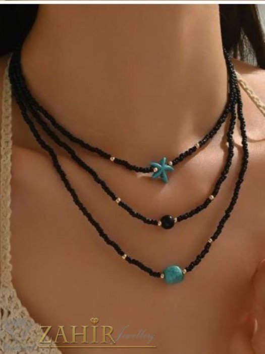 АРТ БИЖУТА С МЪНИСТА - Елегантен комплект от 3 броя колиета с черни мъниста с морска звезда, топче черен ахат и камък тюркоаз, размери 36, 40, 45 см - N1456