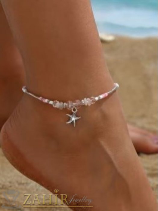 Превърнете всяка стъпка в морско приключение с този ефектен анклет! Комбинацията от естествени форми и нежни цветове прави тази гривна за крак идеалния завършек на вашата плажна или ежедневна лятна визия.