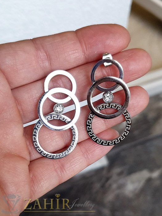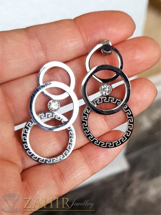 Дамски бижута - Елегантни гравирани висящи обеци от медицинска стомана с кристал ,размери 4 на 2 см, закопчаване на винт- O2801