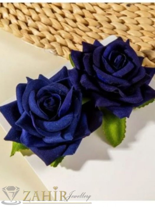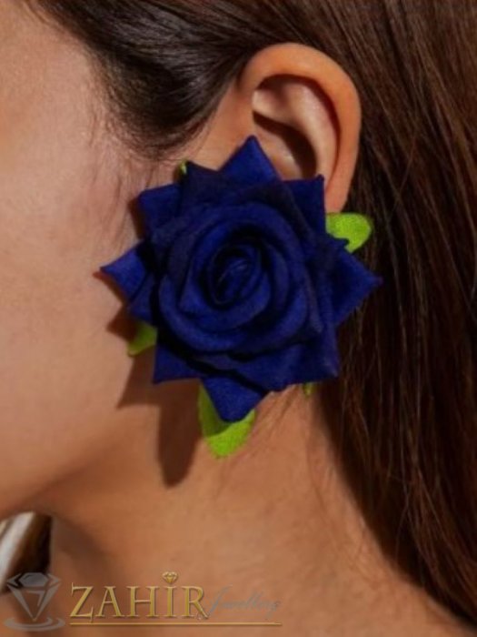 АРТ БИЖУТА С МЪНИСТА - Елегантни обеци с големи тъмносини рози с фини зелени листенца, размер 6,5 см,на винт - N1532