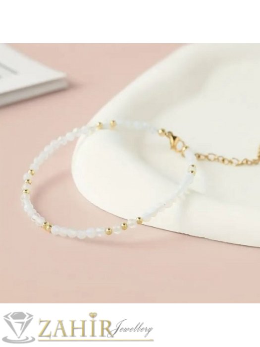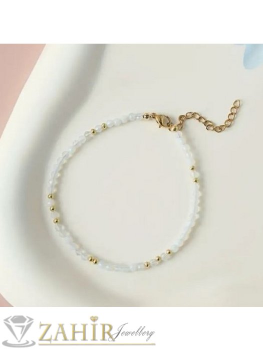ДАМСКИ БИЖУТА - Мега яка гривна за ръка или глезен от естествен бял ахат 3 мм топче и стоманени елементи, закопчалка и удължител - GA3014