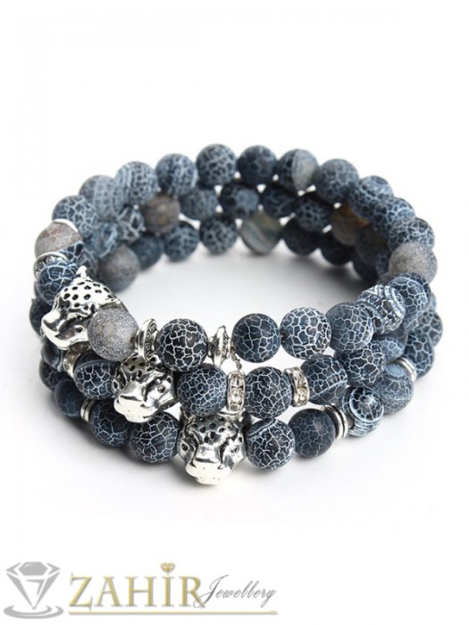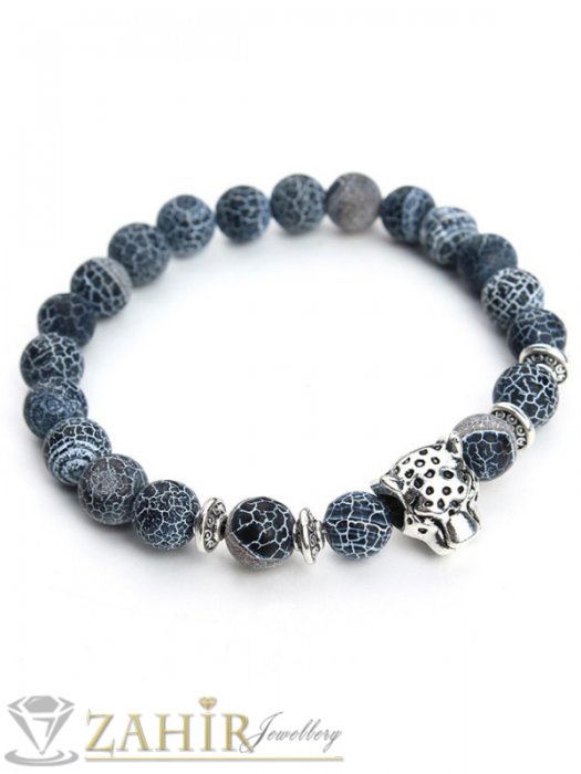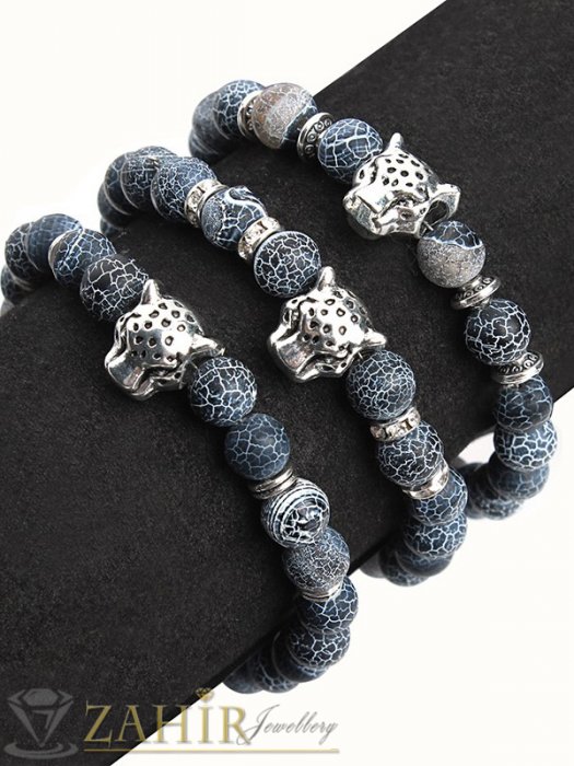 Дамски бижута - Сребриста глава на Пантера на ластична гривна от сив напукан ахат 8 мм, налична в 7 размера - MGA1398