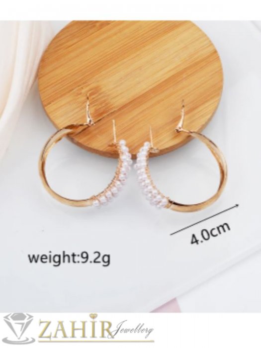 АРТ БИЖУТА С МЪНИСТА - Интересен модел обеци халки 4 см в Бохо стил с малки синтетични перли, златиста основа - N1228