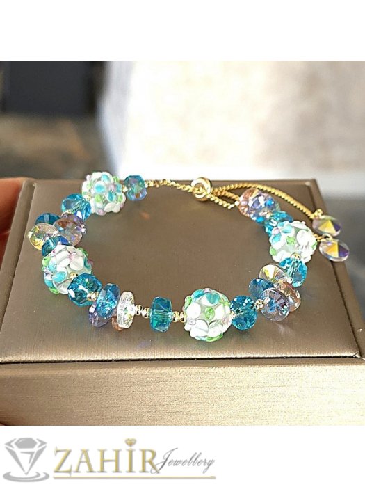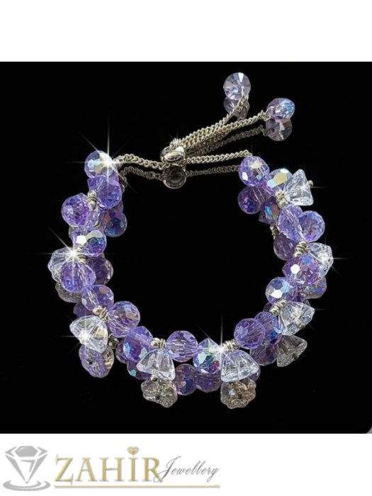 ДАМСКИ БИЖУТА - Изумителна ръчно изработена гривна с пречупващи светлината Аурора Бореалис кристали в прозрачно и виолетово, позлатени мъниста, регулируем размер 17-24 см - V1027