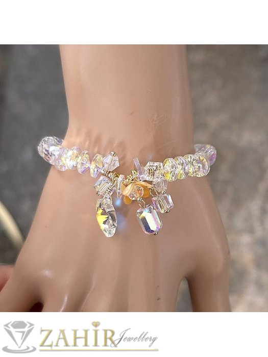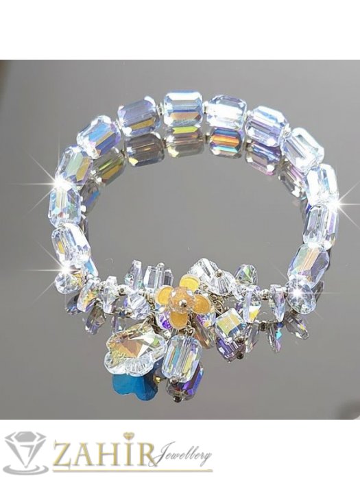 В Бижутерия Захир вярваме, че едно бижу трябва да бъде не само аксесоар, а истинско преживяване. Нашата ръчно изработена гривна V1042 е създадена с внимание към всеки детайл, за да подчертае женствеността и да внесе усещане за изключителност. Използвани са австрийски кристали от най-висок клас, които пречупват светлината по неповторим начин и създават ефектен хамелеон блясък. В съчетание с кристални елементи и изящен дизайн, тази гривна се превръща в малко произведение на изкуството.