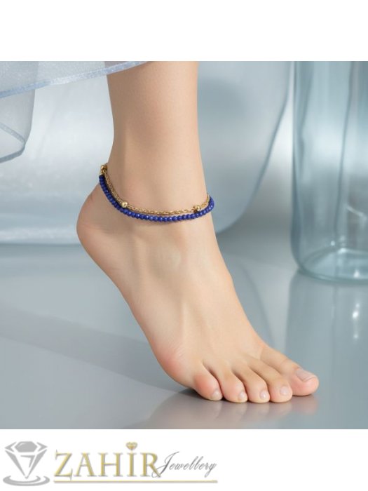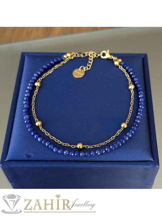 ДАМСКИ БИЖУТА - Изящна двойна гривна за ръка или глезен от естествен тъмносин ахат 3 мм и стоманена верижка с топчета, стоманени накрайници - GA3213
