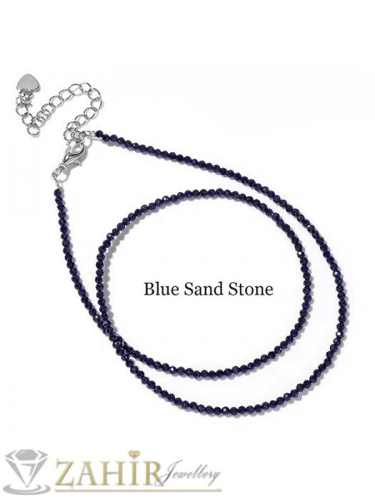 ДАМСКИ БИЖУТА - Нежно ръчно изработено колие от малки 3 мм естествени камъни фасетиран тъмносин слънчев камък, стоманени накрайници - KA1058