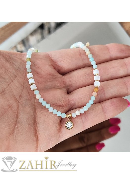 ДАМСКИ БИЖУТА - Романтично ръчно изработено колие от малки 3 мм естествени камъни фасетиран амазонит и висулка кристал, стоманени накрайници - KA1046