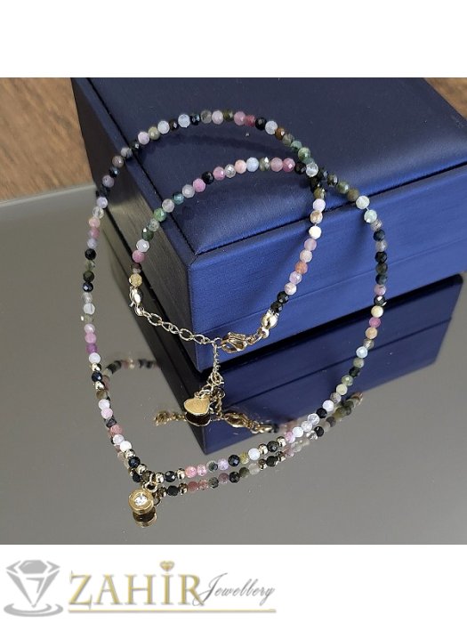 ДАМСКИ БИЖУТА - ТАЛИСМАН - ръчно изработено колие от малки 3 мм естествени камъни фасетиран разноцветен турмалин, стоманен кристал в оков 0,7 см и накрайници - KA1107