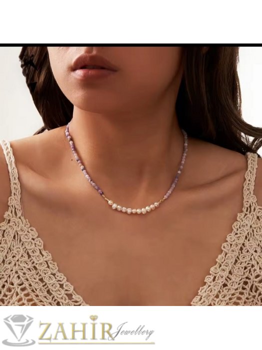 ДАМСКИ БИЖУТА - Уникално ръчно изработено колие от малки 3 мм естествени камъни лилав аметист и бели речни перли, стоманени накрайници - KA1044