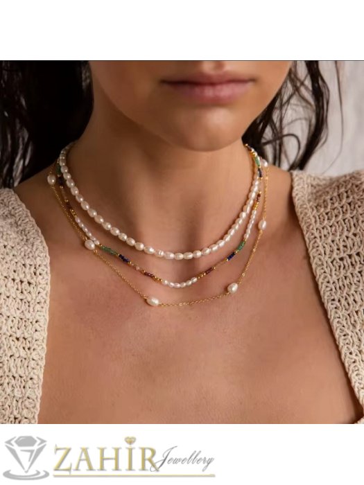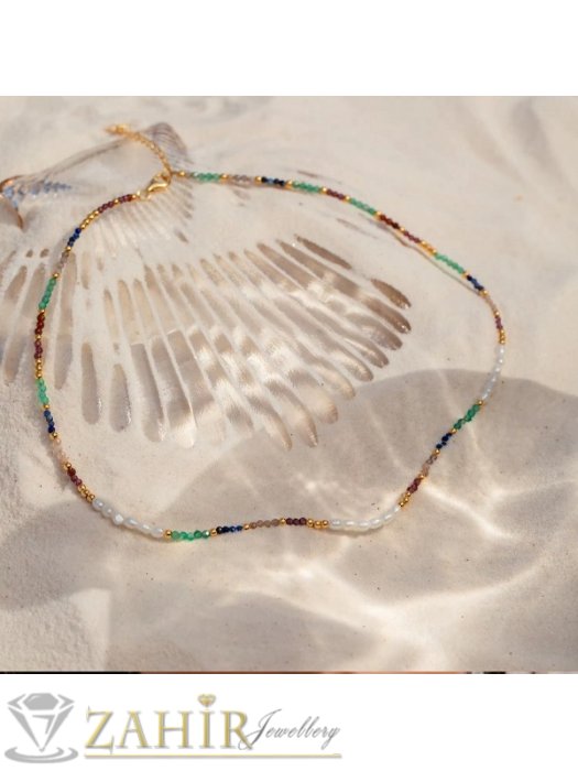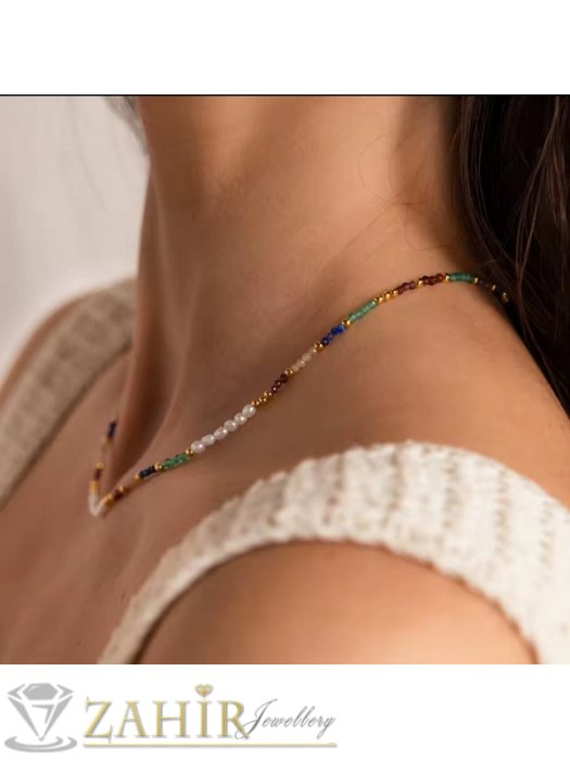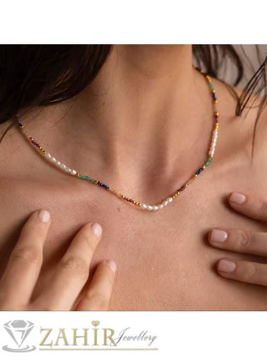 ДАМСКИ БИЖУТА - Уникално ръчно изработено колие от малки 3 мм разноцветни естествени камъни и бели речни перли, стоманени накрайници - KA1045