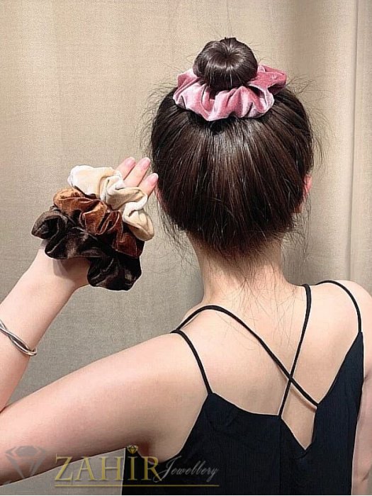 Аксесоари за коса - Комплект от 4 бр. малки велурени ластици за коса тип скрънчи с диаметър 8 см, в бежово-кафявата гама, много меки - L1151