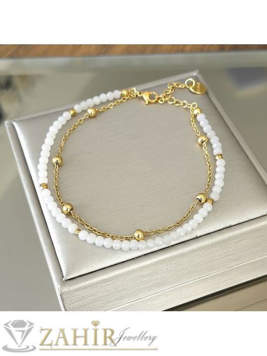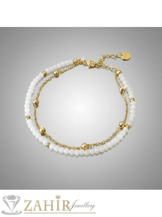 ДАМСКИ БИЖУТА - Красива гривна за ръка или глезен от естествен бял нефрит 3 мм и стоманена верижка с топчета, стоманени накрайници - GA3218