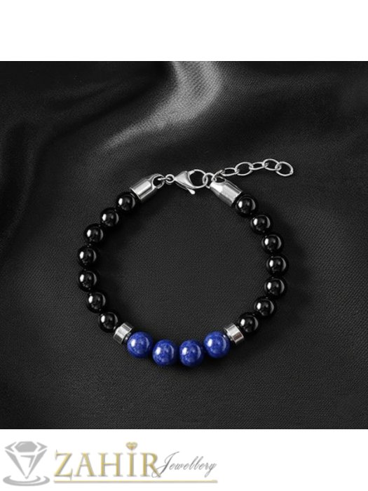 ДАМСКИ БИЖУТА - Красива ръчно изработена гривна от полиран черен оникс и тъмносин лазурит 8 мм, ефектни стоманени накрайци - MGA1701