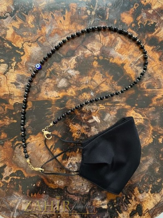 АРТ БИЖУТА С МЪНИСТА - Луксозен хендмейд синджир за очила изработена от наситени черни мъниста, синьо око и фини златисти детайли, дълга 76 см - N1702
