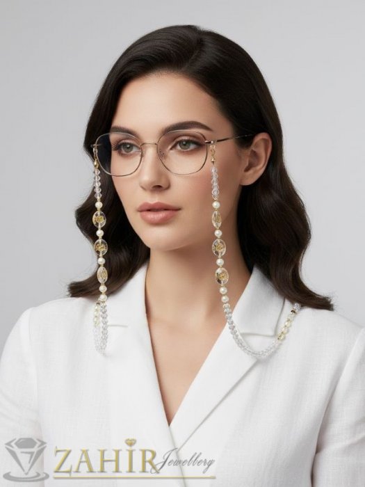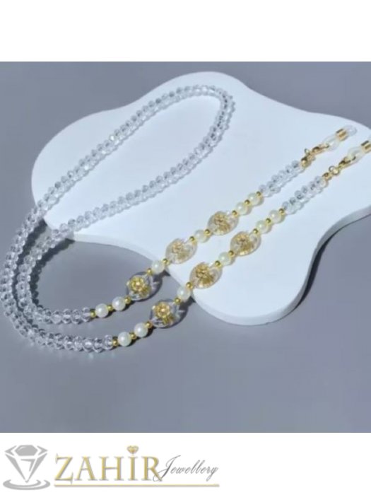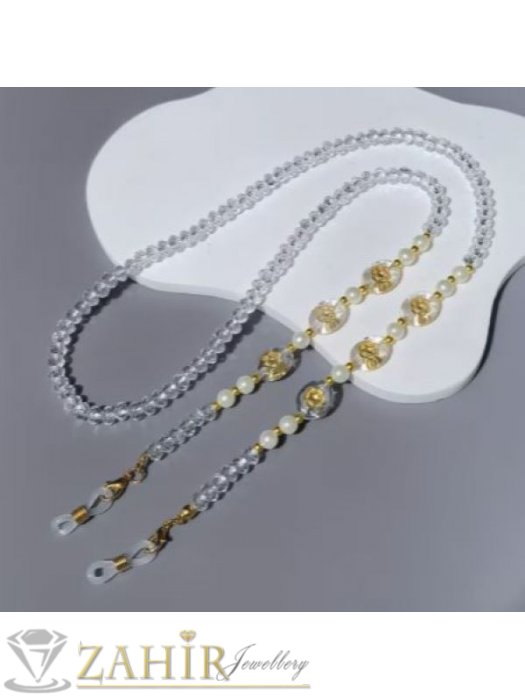 АРТ БИЖУТА С МЪНИСТА - Луксозна кристална верижка за очила с прозрачни фасетирани мъниста 6 мм, вградени златни детайли и перли, дълга 79 см - N1674