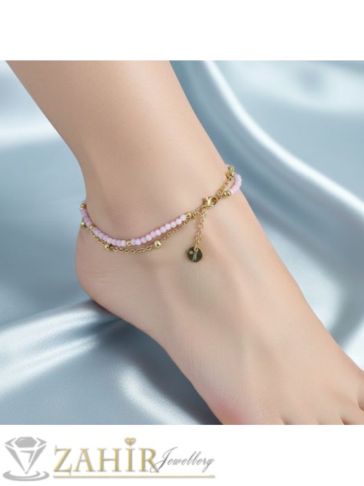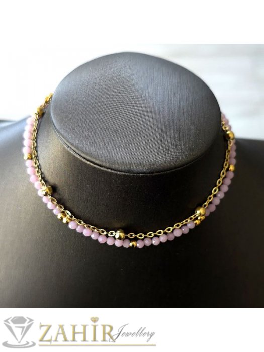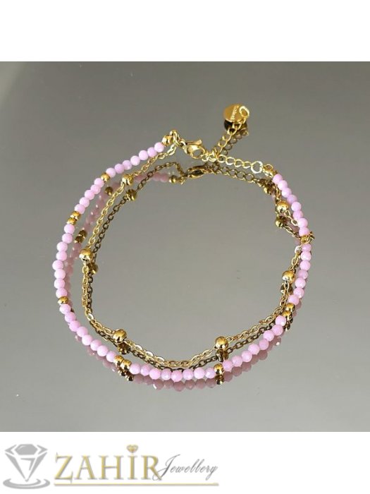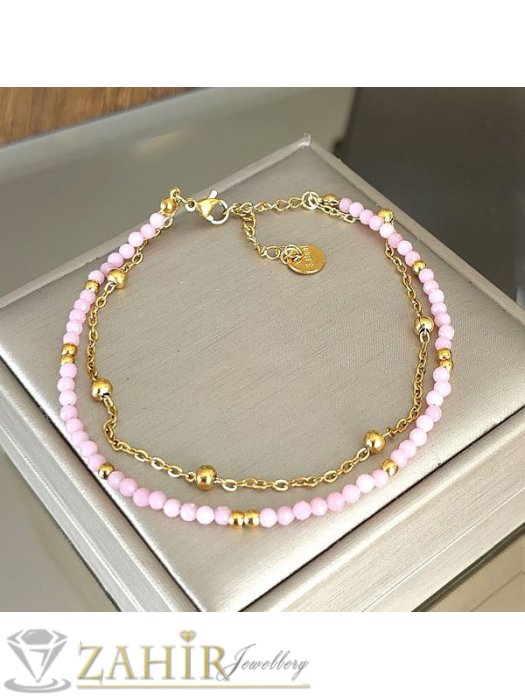 Розова гривна от естествен камък родохрозит и неръждаема стомана – стилна и енергийно заредена бижутерия за ежедневието. Фините фасетирани мъниста от родохрозит са прецизно нанизани и комбинирани с малки златисти елементи от висококачествена неръждаема стомана, която не потъмнява и е устойчива на износване.