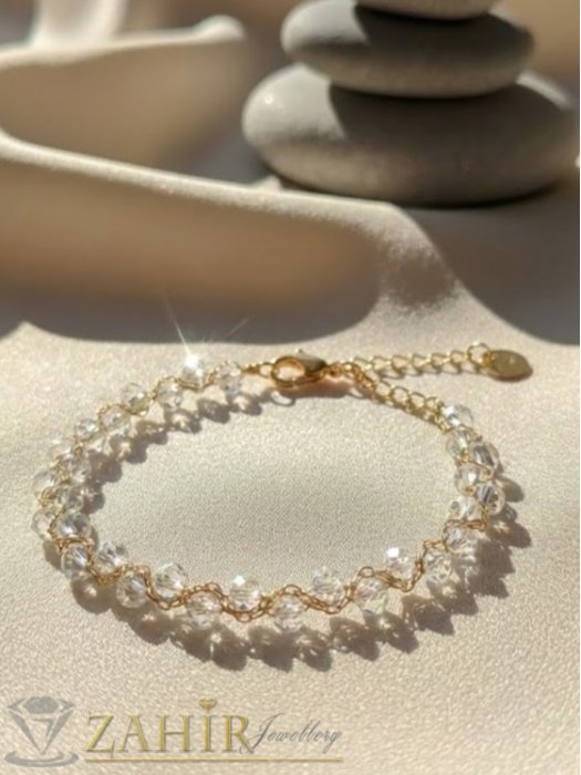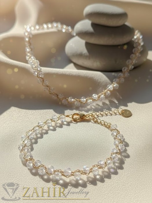 Дизайн: Комплект от фино колие тип чокър и гривна, изработени от прецизно фасетирани кристални мъниста в безцветно.