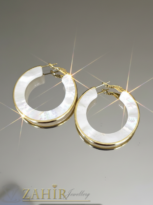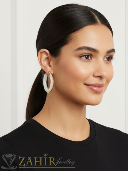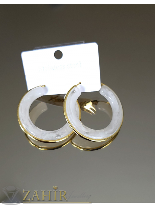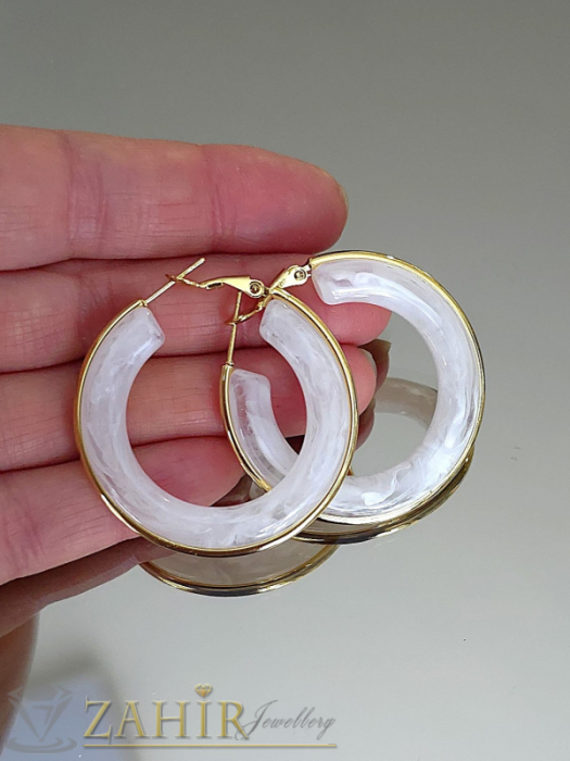 ДАМСКИ БИЖУТА - Модерни обеци тип халки от позлатена стомана с бял акрилен дизайн, 4 см диаметър, стабилно закопчаване - C1321